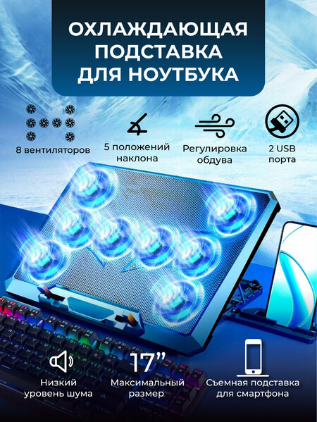 Охлаждающая подставка укомплектована 8 вентиляторами. Они обеспечивают направленный поток воздуха на днище ноутбука, где расположен воздухозаборник, чтобы эффективно снизить температуру игрового ноутбука, либо игровой консоли или роутера. Габариты подставки - 363x259x33 мм. Все 8 вентиляторов охлаждающей подставки имеют бесщеточные моторы и дополнены конденсаторными компонентами для снижения шума при работе. При этом не будет снижаться скорость вращения вентилятора и не будет раздражающего шума. Если Вам в данный момент не требуется большой поток воздуха, Вы можете снизить его регулировкой скорости вращения вентиляторов с помощью специального колесика или вовсе отключить вентиляторы. В комплект поставки входит складной держатель для смартфона, его можно убирать в корпус подставки. Основание и корпус из термореактивного пластика имеют приятную текстуру и в то же время более прочны. Поверхность - графеновая сетка из углеродистой стали с усиленным теплоотводом. Подставка совместима с экранами ноутбуков до 17". Имеются два порта USB, в комплект входит USB-кабель питания длиной 66 см. Две ножки используются для увеличения устойчивости большого и тяжелого ноутбука на поверхности охлаждающей подставки. Ножки складные и убираются в корпус для удобства. Пять регулируемых настроек высоты обеспечивают универсальные варианты позиционирования, позволяя использовать подставку в вертикальном или плоском положении в соответствии с вашими эргономическими предпочтениями и улучшая воздушный поток ноутбука. Эта охлаждающая стойка может быть легко подключена к вашему ноутбуку через интерфейс USB. Она также имеет два порта USB 2,0 для передачи данных или подключения других устройств, что обеспечивает дополнительное удобство. Размер вентиляторов - 60*60*15мм (x 8) Уровень шума: 25 (мин скорость) - 30 (максимальная скорость) Дб Скорость вращения вентиляторов - 2600 об/мин (+/- 10%) Цвет подсветки вентиляторов - синий Питание - 0.75A (+/-10%) / 5В Мощность - 3.75 (+/- 10%) Вт