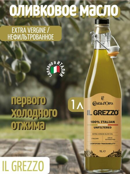 Оливковое масло IL Grezzo естественно мутное и плотнее, чем чистое оливковое масло, так как разливается точно в том виде, в котором поставляется с завода после обработки оливки. Благодаря этому масло IL Grezzo является более здоровым выбором - оно содержит по меньшей мере на 30% больше полифенолов и витаминов, чем фильтрованное оливковое масло. Оно обладает специфичным вкусом и душистым ароматом, легко усваивается, подходит для диетического питания, насыщает организм витаминами и микроэлементами. Благодаря большому содержанию витамина Е способствует омоложению организма, улучшая структуру, волос и ногтей, благотворно влияя на состояние кожи. Ненасыщенные жирные кислоты ускоряют метаболические процессы и увеличивают скорость жиросжигания. Постоянное употребление оливкового масла укрепляет иммунитет. IL Grezzo станет прекрасной заправкой к салатам из-за более плотной (в отличие от фильтрованного оливкового масла) консистенции масло обволакивает ингредиенты, а не скапливается на дне блюда. Возможно выпадение естественного осадка на стенках и дне бутылки. При температуре менее +10 оливковое масло может поменять свой цвет и дать белый осадок. При комнатной температуре оливковое масло возвращается в свое первоначальное состояние без ущерба для качества продукта. Масло Costa d’Oro Il Grezzo продается в прозрачной бутылке со сменной крышкой. Для чего нужна эта крышечка? Чтобы вы могли пользоваться бутылкой после использования масла! Просто тщательно вымойте бутылку, снимите крышку и замените ее на защелкивающуюся. Установите ее таким образом, чтобы при движении вниз пробка закупоривала бутылку, а при движении вверх — вылетала наверх. ⠀ Благодаря герметичной и удобной крышке в такой бутылке можно хранить что угодно: домашний лимонад, свежевыжатый сок или даже сыпучие продукты