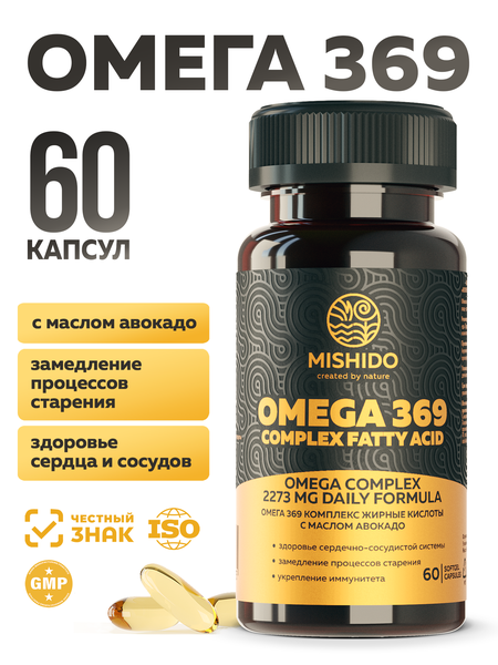 Омега 369 комплекс жирные кислоты с маслом авокадо, льняное масло является дополнительным источником моно- и полиненасыщенных жирных кислот, необходимых для правильного функционирования всех органов для взрослых женщин, мужчин, девушек, для подростков и школьников, для спортсменов, пожилых. Правильно сбалансированный комплекс способствует укреплению сердечно-сосудистой, нервной, иммунной, эндокринной систем, профилактике онкологических заболеваний, улучшению памяти, зрения, обменных процессов в организме, усвоению глюкозы, предупреждая развитие диабета, укреплению костей, нормализации артериального давления, уровня холестерина и триглицеридов в крови. Предотвращает выпадение волос, расслоение ногтей, способствует оздоровлению, увлажнению, эластичности кожи и разглаживанию мелких морщин, укрепляет капилляры, уменьшает выраженность темных кругов под глазами и сосудистых звездочек. БАДы Омега 3 Мишидо производятся только из премиум сырья швейцарской компании DSM (Перу) на современном технологичном оборудовании, что обеспечивает premium качество продукции omega3. Omega 3 6 9 complex fatty acid (fish oil) обладает иммуно-стимулирующими, антиоксидантными и противоопухолевыми свойствами. Витаминный комплекс предназначен для сохранения здоровья, молодости и работоспособности всех членов семьи.