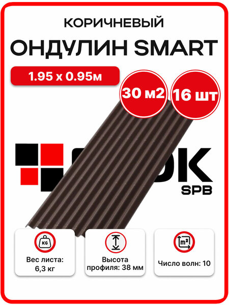 Ондулин – это легкий и прочный волнистый кровельный и облицовочный материал. Листы широко используются как в частной и дачной застройке, так и в жилищном и промышленном строительстве. Применяется при углах ската от 5 до 90 градусов. Хорошо гнется вдоль и поперек волны и может быть использован на криволинейных поверхностях с радиусом изгиба от 5 метров и больше. Гарантия от протекания 15 лет. Ондулин не шумит при дожде, не ржавеет, не греется на солнце, его просто монтировать и перевозить. Система Смарт Лок – две выдавленные по краям листа полосы, которые позволяют сократить перекрытие с 17 до 12 см и помогают безошибочно определить требуемый нахлест. Листы Ондулина окрашиваются перед пропиткой битумом, что делает цвет более устойчивым. В палитре цветов собраны самые универсальные расцветки: красный, коричневый, зелёный и благородный серый. Характеристики: Толщина листа: 3 мм Ширина листа: 950 мм Длина листа: 1950 мм Вес листа: 6,3 кг Вес м2: 3,4 кг Высота профиля: 38 мм Число волн: 10 Шаг волны: 95 мм Число гвоздей на лист: 20.