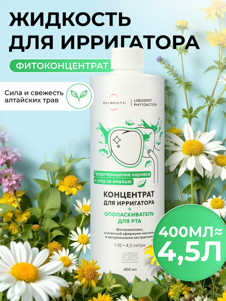 Многофункциональное современное средство на основе экстрактов экологически чистых трав и натуральных эфирных масел, имеющее противовоспалительное и обволакивающее действие – Средство 2 в 1 - Жидкость для ирригатора концентрат и опласкиватель для рта «Фитокомплекс» от ON WHITE. При каждодневном применении успокаивает десна, снижает кровоточивость, заживляет микроповреждения и создаёт барьер, защищающий полость рта от кариеса и проникновения болезнетворных микроорганизмов. Ведущие компоненты : Пребиотик ксилит и Глицирризинат - способствуют повышению барьерных функций ротовой полости. В итоге останавливается жизнедеятельность и распространение кариозных бактерий, прекращается эрозия эмали, восстанавливается нормальная микрофлора полости рта и останавливается распространение налета. Фитокомплекс, усиленный эфирными маслами и натуральными экстрактами экологически чистых трав (ромашки, календулы, мелисы и иван-чая) стимулирует все оздоровительные процессы. Ускоряется регенерация мягких тканей, повышается эффективность зубных паст, восстанавливается свежесть дыхания. Имеет пролонгированный эффект. Прекрасно подходит для профилактического ежедневного использования как с помощью ирригатора, так и как самостоятельный ополаскиватель натурального происхождения. Прекрасно восстанавливает микрофлору полости рта после установки/снятия брекет систем, хирургических и ортодонтических вмешательств. Одна бутылочка концентрата ON WHITE заменит 4,5 литра обычного средства для ирригатора. Просто разведите раствор в пропорции 1:10, залейте в контейнер вашего ирригатора и используйте гаджет как обычно – 1-2 раза в день. Уход за полостью рта с ON WHITE!