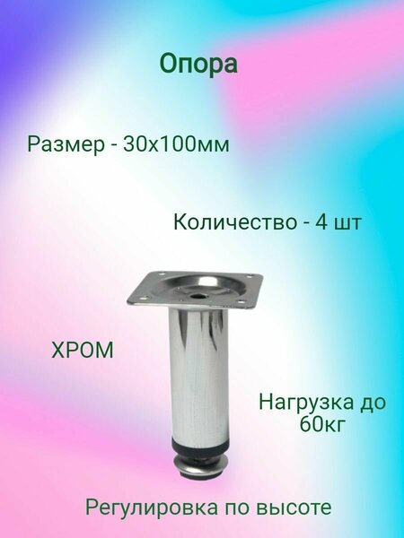 Опора декоративная мебельная d30х100мм, хром – это высококачественная фурнитура для мебели, которая станет незаменимым элементом в вашем доме или офисе. Опора изготовлена из прочного металла, что гарантирует ее долговечность и надежность. Хромированное покрытие придает изделию стильный и современный вид, а также защищает металл от коррозии. Опора имеет диаметр 30 мм и установочный размер 100 мм, что позволяет использовать ее в различных типах мебели. Максимальная нагрузка на опору составляет 60 кг, что делает ее подходящей для большинства видов мебели. Опора оснащена колесами, что обеспечивает удобство при перемещении мебели. Опора декоративная мебельная d30х100мм, хром проста в установке: она крепится на саморезы, что позволяет быстро и надежно закрепить ее на мебели. Опора поставляется в комплекте из 4 штук, что позволяет сразу же использовать ее для нескольких предметов мебели. Опора декоративная мебельная d30х100мм, хром произведена в Китае, что гарантирует доступность и качество товара.