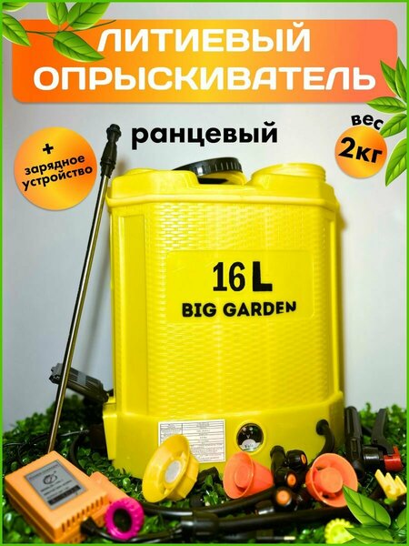 Возможны следы воды-мы тестируем перед отправкой каждый товар. НОВИНКА! 8 насадок . Опрыскиватель с литиевым аккумулятором. Для здорового и красивого участка, который будет цвести и радовать вкусными плодами — нужно ухаживать и своевременно обрабатывать от всевозможных болезней, жучков и сорняков. Ручные (помповые) и гидравлические агрегаты, уже давно себя изжили и морально устарели. А на смену им пришел аккумуляторный опрыскиватель Гарден. Литиевый аккумуляторный опрыскиватель Big Garden - вы можете забыть про изнурительные подкачки, сэкономить время и силы. Литиевый аккумуляторный опрыскиватель Big Garden необходим для того, чтобы: предотвратить заболевания растений, обеспечить защиту саду и огороду уничтожить насекомых, наносящих вред. Электрический опрыскиватель поставляется с литиевой аккумуляторной батареей ёмкостью 8 А/ч, которая имеет ряд преимуществ по сравнению с традиционной свинцово-кислотной батареей:-легкий вес - вес литиевой батареи более чем в 3 раза меньше аналогичной по параметрам свинцовой-кислотной-высокая энергетическая плотность-низкий саморазряд-отсутствие "эффекта памяти"-минимальная потеря емкости при отрицательных температурах-минимальное время необходимое для заряда и длительный период эксплуатации от заряда до разряда. Ранцевый опрыскиватель садовый можно использовать для борьбы с сорняками и распыления воды. Длина шланга 1,4м. Также подходит для удобрений, гербицидов, пестицидов и противоэпидемической обработки скота. Также аккумуляторный распылитель для дачи может использоваться для дезинфекции, дезинсекции и мытья различных поверхностей. Автоматический опрыскиватель ранцевый поможет помыть окна, стены и автомобиль. А также побелить стены и потолки. Пластик садовый опрыскиватель инвентарь устойчив к агрессивным средам. Автоматический опрыскиватель ранцевый легко справится с обработкой овощных культур. Пульверизатор для растений аккумуляторный поможет поддержать естественную влажность листа и устранить сорную растительность. Аккумуляторный распылитель побелки проведет противоэпидемические обработки скота. Со штанги электро опрыскиватель садовый жидкость подается на большое расстояние, так что вдыхать ядовитые пары не нужно. Электрический пульверизатор садовый инвентарь имеет хорошую и равномерную струю. Другие автоматические опрыскиватели садовые не превосходят по качеству аккумуляторный опрыскиватель Гарден объемом 16 литров для полива растений, для распыления лекарств и пестицидов. Опрыскиватель для сада и дачи, также подойдет для машины. Электро опрыскиватель садовый распыляет на дальность 5-8 м. Аккумуляторный опрыскиватель для дачи включает 8 разных насадок, время работы до 6-ти часов. Трубка и насадки находятся внутри ранцевого опрыскивателя садового. Давление аккумуляторного опрыскивателя для дачи держится за счет работы аккумулятора (12v, 8Ah), который можно зарядить от электросети 220 В. Автоматический опрыскиватель садовый весом 2 кг. Применяйте ранцевый распылитель для деревьев вы облегчаете свою работу. Надеваете опрыскиватель для сада и дачи с помощью лямок на плечи. Благодаря широкому плечевому ремню аккумуляторный опрыскиватель снимает напряжение с мышц спины во время эксплуатации. Аккумуляторный распылитель побелки регулирует мощность распыления. Элек