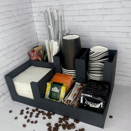 Органайзер барный для кофе зоны. Органайзер универсальный деревянный для одноразовых стаканов, крышек, размешивателей для чая и кофе, салфетница, для кофейных и чайных стиков. Диспенсер для кофе зоны отличная идея как для дома так и для офиса, отлично подойдёт в места общественного питания - кафе, бар, ресторан и зона самообслуживания для приготовления кофе в магазинах торговых центрах. Органайзер имеет натуральный цвет венге. Общий размер: длина 33см; ширина 21см; высота 15см. Подставка состоит из 8 отсеков, в которые можно разместить всё, что нужно при приготовлении горячих и холодных напитков.