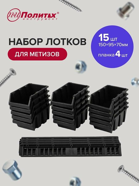 Набор лотков для метизов 150х95х70 мм– это удобное и практичное решение для организации рабочего места. Органайзер для хранения изготовлен из прочного пластика, что гарантирует долгий срок службы и надежную защиту содержимого от пыли, влаги и механических повреждений. Компактные размеры лотка (высота 7 см, длина 15 см, ширина 9,5 см) позволяют разместить его даже в ограниченном пространстве. В комплекте: 15 лотков, предназначенных для организации хранения метизов и других мелких предметов, и 4 планки-держателя для них. Органайзер для инструментов настенный можно штабелировать вертикально или крепить на планке-держателе горизонтально. Лотки для метизов с планкой легко моются и не теряют свой внешний вид даже после многократного использования. Выбирая модульный набор лотков для метизов, вы получаете надежное и удобное решение для организации хранения мелких деталей, инструментов и метизов. А также такой органайзер для гаража полезный подарок для мужчины на день рождения, Новый год, 23 февраля и другой праздник.