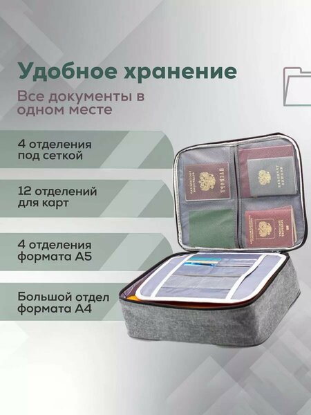 Если вы хотите, чтобы все документы были аккуратно сложены, тогда обратите внимание на сумку органайзер для хранения документов. Сумка для хранения документов - отличный способ держать все документы в порядке и в одном месте. Такие документы, как паспорта, трудовые книжки, аттестаты, дипломы, налоговые, медицинские, пластиковые карты визитки и другие будут удобно разложены в органайзере. Важным плюсом органайзера для документов и вещей является то, что сумку для документов удобно брать с собой в дорогу, командировки и путешествия. Органайзер для документов обеспечивает сохранность документации и препятствует ее замятию. Сумка для документов - это вместительный кофр с 4 отделениями для паспортов, 12 кармашками для карт, 4 файлами под сеткой, карманом под папку и основным отделением для других бумаг. Вы можете положить в него папки и бумаги. Сумка для хранения документов имеет специальный ремень для крепления на ручки чемодана. Это удобный предмет для бережного хранения документов от пыли, влаги, солнечного излучения и механических повреждений. Используя органайзер для хранения документов, вы легко организуете аккуратное хранения вещей и документов.