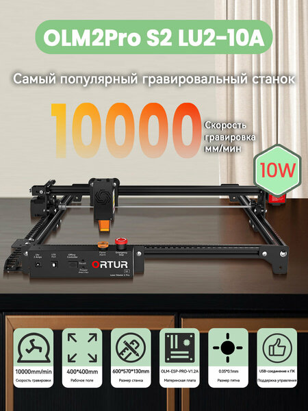 Лазерный гравер Ortur Laser Master 2 Pro S2 LU2-10A (40 Вт) Профессиональный ЧПУ-гравер для гравировки и резки различных материалов с высокой точностью. Отличается мощным лазерным модулем и большой рабочей областью. Основные характеристики: Лазер: LU2-10A, оптическая мощность 9500–10500 мВт Общая мощность: 40 Вт Скорость гравировки: до 15 000 мм/мин Рабочая область: 400 × 400 мм Размер пятна: 0,05 × 0,1 мм Материнская плата: OLM-MAXUP-V10 с 32-битным чипом Корпус: алюминиевый профиль + сталь Поддержка форматов: JPG, PNG, BMP, SVG и др. Совместимость: Windows, macOS, Linux Программное обеспечение: LaserGRBL (бесплатно), LightBurn (платно) Особенности: Технология двойного сжатия (dual-compression diode) Прецизионная гравировка 2D и 3D изображений Подходит для: дерева, акрила, кожи, картона, МДФ, керамики, анодированного алюминия и др. Безопасность: кнопка аварийной остановки, датчик возгорания, защита от перегрева и положения Установка за 10–20 минут Встроенные шкалы и устойчивая конструкция Комплектация: Станок Лазерный модуль с защитой Адаптер питания Защитные очки Тестовые материалы (дерево, акрил) Инструменты для сборки Кабельные стяжки, кисть и руководство Рекомендация: для стабильной работы очищайте линзу каждые 50 часов спиртовым тампоном. Гарантия: 1 год