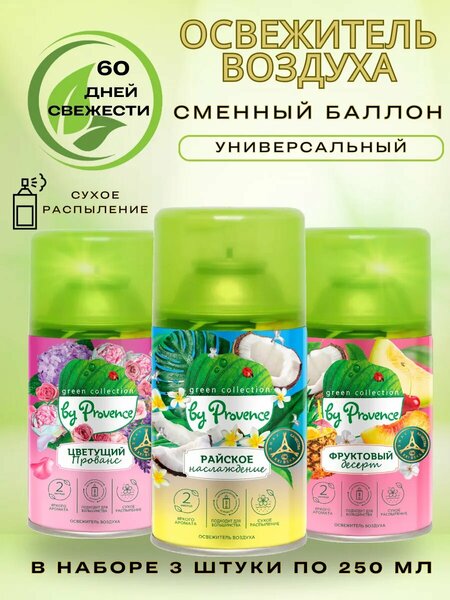 Набор 3 штуки Автоматический освежитель воздуха Green collection by Provence Цветущий прованс, Райское наслаждение, Фруктовый десерт - наполняет ваш дом приятными ароматами. Освежитель воздуха Green collection by Provence - это набор из 3 штук Освежитель воздуха Green collection by Provence Ягодное Наслаждение, Лазурные Альпы, Цветущий Провенсе - эко система очищения воздуха Ecofresh увлажняет воздух, не разрушая озоновый слой планеты Включает в себя разнообразие ароматов, чтобы вы могли подобрать то, что вам больше всего нравится. Green collection by Provence наполняет ваш дом приятными ароматами, избавляет от неприятных запахов в туалете и сохраняет приятный запах в комнате и на кухне, свежий, легкий аромат в Вашем доме. Освежитель воздуха не оставляет следов на кафельной плитке, потолке, обоях, гардинах и мебели. Освежитель воздуха Green collection by Provence принадлежит российскому производителю парфюмерно-косметической продукции. Гипоаллергенный состав. Вы можете поддерживать аромат чистоты и свежести дома без вреда для здоровья. Обладает ярко выраженным действием против запаха табачного дыма. Большого аэрозоля хватит на долго в Вашем доме. С этим набором вы получаете полный спектр возможностей для освежения воздуха в вашем доме. Вы будете рады узнать, что освежитель воздуха Green collection by Provence имеет автоматический баллон, который облегчает его использование. Вы просто устанавливаете его в нужном месте, и он автоматически распыляет аромат, поддерживая воздух чистым и свежим. Это удобно и экономично, так как вы можете использовать одно устройство с различными ароматами. Ароматизатор для дома спрей Provence балон арома обеспечивает длительное и равномерное распыление аромата, чтобы вы могли наслаждаться свежестью и приятным запахом. Этот набор освежителей воздуха идеально подойдет для использования в ванной и туалете, как средство для ковров и от запаха животных для чистки дивана, как поглотитель запаха для помещений.