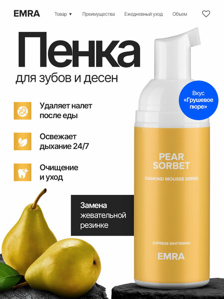 {"widgets":{"@card/UniversalPromoBadge":{"/content/page/fancyPage/universalPromoBadge":{"wrapperProps":{"margins":{"bottom":"3"}},"initialTime":1759571538700,"offerComposeId":"1748436459"}}},"meta":{"/content/page/fancyPage/universalPromoBadge":{"name":"@card/UniversalPromoBadge"}},"collections":{"productServiceSnippets":{"1748436459":{"productSnippet":{"type":"MODEL_CARD_LAYOUT","productPayload":{"title":{"value":"Отбеливающая пенка для полости рта Pear Sorbet от EMRA"},"badges":{},"wishlistButton":{"mskuId":103723411946,"businessId":2153445,"modelId":1748436459,"oskuId":103619025375},"rating":{"reviewsCount":187,"ratingCountStats":{"cnt3":12,"cnt4":25,"cnt2":6,"cnt1":9,"cnt5":465},"ratingValue":4.8,"ratingCount":517},"gallery":{"galleryType":"VISUAL","mediaItems":[{"type":"IMAGE","picture":{"height":1600,"width":1200,"title":"Отбеливающая пенка для полости рта Pear Sorbet от EMRA","baseUrl":"https://avatars.mds.yandex.net/get-mpic/12800328/2a0000019662596050d2f80e9d41d5d5d92d/"}},{"type":"IMAGE","picture":{"height":1600,"width":1200,"title":"Отбеливающая пенка для полости рта Pear Sorbet от EMRA","baseUrl":"https://avatars.mds.yandex.net/get-mpic/12631449/2a000001966278ef3ab07ffc6e9f89239137/"}},{"type":"IMAGE","picture":{"height":1600,"width":1200,"title":"Отбеливающая пенка для полости рта Pear Sorbet от EMRA","baseUrl":"https://avatars.mds.yandex.net/get-mpic/15332119/2a000001966278ef39df5b8e2b7bee57f365/"}},{"type":"IMAGE","picture":{"height":1600,"width":1200,"title":"Отбеливающая пенка для полости рта Pear Sorbet от EMRA","baseUrl":"https://avatars.mds.yandex.net/get-mpic/11255353/2a000001978796b9193d0133001ee86e0bec/"}},{"type":"IMAGE","picture":{"height":1600,"width":1200,"title":"Отбеливающая пенка для полости рта Pear Sorbet от EMRA","baseUrl":"https://avatars.mds.yandex.net/get-mpic/13448948/2a000001966278ef3955bade2d924b2e31aa/"}},{"type":"IMAGE","picture":{"height":1600,"width":1200,"title":"Отбеливающая пенка для полости рта Pear Sorbet от EMRA","baseUrl":"https://avatars.mds.yandex.net/get-mpic/3609127/2a000001966278ef343a90ac1618343a1b3d/"}},{"type":"IMAGE","picture":{"height":1600,"width":1200,"title":"Отбеливающая пенка для полости рта Pear Sorbet от EMRA","baseUrl":"https://avatars.mds.yandex.net/get-mpic/14354979/2a000001966278ef3b5d8b049b8b8da83161/"}},{"type":"IMAGE","picture":{"height":1600,"width":1200,"title":"Отбеливающая пенка для полости рта Pear Sorbet от EMRA","baseUrl":"https://avatars.mds.yandex.net/get-mpic/5023672/2a000001966278ef3967ce01fa98500b4885/"}},{"type":"IMAGE","picture":{"height":1600,"width":1200,"title":"Отбеливающая пенка для полости рта Pear Sorbet от EMRA","baseUrl":"https://avatars.mds.yandex.net/get-mpic/14873814/2a000001966278ef38262a2fd265770d7ed8/"}},{"type":"IMAGE","picture":{"height":1600,"width":1200,"title":"Отбеливающая пенка для полости рта Pear Sorbet от EMRA","baseUrl":"https://avatars.mds.yandex.net/get-mpic/7728649/2a000001978796b91dc4b6124211deffdb94/"}},{"type":"IMAGE","picture":{"height":1600,"width":1200,"title":"Отбеливающая пенка для полости рта Pear Sorbet от EMRA","baseUrl":"https://avatars.mds.yandex.net/get-mpic/12461896/2a000001978796b91a04b940dbbf41d3b035/"}},{"type":"IMAGE","picture":{"height":1600,"width":1200,"title":"Отбеливающая пенка для полости рта Pear Sorbet от EMRA","baseUrl":"https://avatars.mds.yandex.net/get-mpic/4465823/2a000001966278ef3b6cca690b7ce4bedfbd/"}},{"type":"IMAGE","picture":{"height":1600,"width":1200,"title":"Отбеливающая пенка для полости рта Pear Sorbet от EMRA","baseUrl":"https://avatars.mds.yandex.net/get-mpic/7631660/2a000001978796b919c44a13fc78920f067e/"}}]},"snippetStyle":"NORMAL"},"baobabPayload":{"marketSku":"103723411946","type":"offer","isUltima":false,"modelId":1748436459,"snippet_type":"product","wareId":"out-of-stock","oskuId":103619025375,"hid":64097957,"isExpress":false,"vendorId":13519106}}}}}}