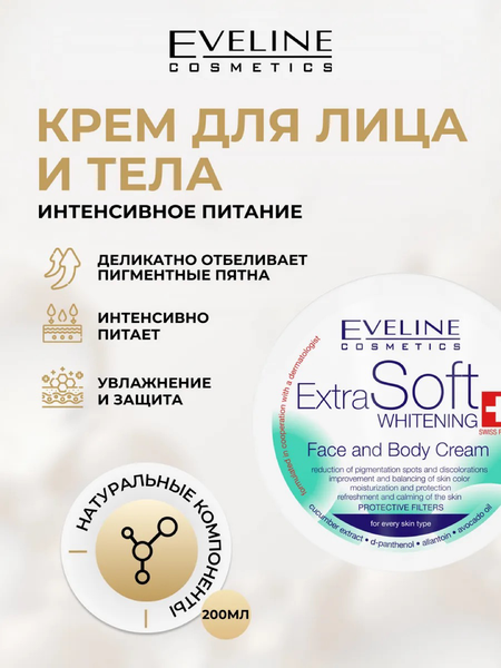 Инновационный отбеливающий крем для лица Extra Soft whitening от Eveline Cosmetics заметно уменьшает существующие пигментные изменения и предупреждает появление новых, благодаря чему кожа приобретает здоровый и ровный цвет. Формула, обогащенная экстрактом огурца, осветляет пигментные пятна, вызванные возврастными изменениями и вредным воздействием солнечных лучей. Комплексное воздействие активных компонентов основательно увлажняет, разглаживает и освежает кожу. Экстракт огурца - содержит витамин С и органические кислоты; осветляет, разглаживает и тонизирует кожу. Масло авокадо - подобно натуральным липидам предохраняет кожу от пересушивания, потери влаги и упругости; питает и основательно регенерирует. Д-пантенол и Аллантоин - нормализуют процесс восстановления клеток кожи, оказывают успокаивающее и противовоспалительное действие, интенсивно увлажняют.