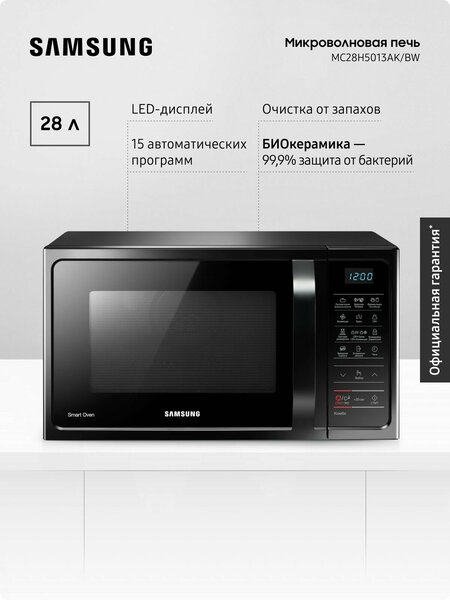 Отдельностоящая микроволновая печь Samsung MC28H5013AK/BW — станет верным помощником в приготовлении любимых блюд! Микроволновка в черном цвете сочетает в себе стильный дизайн и современные технологии. Объем печки в 28 литров позволяет разогревать и готовить еду для всей семьи или небольшой компании. Система регулировки поворотного поддона дает возможность максимально использовать пространство камеры и запекать блюда в больших противнях. Функция Smart Oven предлагает простой способ создания вкусной и здоровой пищи с 15 авторскими рецептами полезного питания. Конвекция помогает пропекать продукты, поэтому вы можете побаловать себя сочными и аппетитными угощениями, таких как капуста брокколи, бурый рис, куриная грудка или филе форели. Готовьте с легкостью тесто или йогурт с помощью новейшей технологии ферментации, для этого достаточно лишь установить нужную температуру. Специальные автоматические программы традиционных рецептов позволяют каждому почувствовать себя шеф-поваром. Плоские кнопки на передней панели и LED-дисплей облегчают управление СВЧ с часами, делая процесс еще более комфортным и интуитивно понятным. БИОкерамическое покрытие имеет гладкую поверхность и легко очищается без применения химических средств. Оно гарантирует стерильность камеры, уничтожая до 99,9% бактерий, не подвержено коррозии, не царапается и служит долго даже при интенсивной эксплуатации. Прибор Самсунг с опцией деодоризации удаляет неприятные запахи, оставляя чистоту и свежесть внутри устройства. Функция ECO Mode значительно сокращает потребление энергии в режиме ожидания, делая использование кухонной бытовой техники не только удобным, но и экономичным. С микроволновкой Samsung готовить легко и приятно!