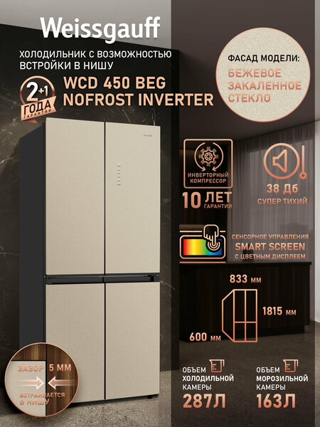 Отдельностоящий холодильник Weissgauff, выполненный в современном европейском дизайне CrossDoor, обладающий инверторным компрессором с гарантией 10 лет, технологиями Multi Air Flow и Metal-Tech Cooling, а также полной системой размораживания Full No Frost - это поистине одна из самых передовых и функциональных моделей холодильников, имеющихся на рынке на сегодняшний день! Воплощая в себе соотношение фантастической вместительности, безупречной эргономики внутреннего пространства, технологического совершенства и великолепного дизайна - он является одним из безусловных флагманов Weissgauff, способным вывести для вас понимание того, на что способен холодильник, на совершенно новый уровень! Габариты устройства 833 х 600 х 1815 мм - это оптимальные параметры, при выборе которых инженеры Weissgauff руководствовались целью создать для вас максимально вместительный и функциональный холодильник, который при этом окажется удобен в установке и не будет занимать лишнее место на вашей кухне! Объем холодильной камеры 287 литров - дает вам полную уверенность в том, что вы легко сможете разместить в холодильнике сразу все необходимые продукты. А особая эргономика внутренних полок позволит вам оптимизировать внутреннее пространство камеры в случае необходимости! Объем морозильной камеры 163 литра, обеспечит гарантию того, что данная модель предоставит вам достаточно места для заморозки и длительного хранения продуктов! Зона свежести с контролем уровня влажности - это особый отсек холодильника, который позволяет создавать отдельный микроклимат для продуктов, требовательных к поддержанию определенного уровня влажности и температуры, близкой к нулю! Фасад модели, выполненный в дизайне "бежевое закаленное стекло" станет финальным штрихом в совершенстве великолепного облика этой модели. Каждый раз, заходя на кухню, вы будете чувствовать, что этот холодильник - не просто функциональное устройство, но и настоящее украшение в интерьере вашей кухни! Система размораживания Full No Frost - это наиболее передовая и эффективная система охлаждения обеих камер устройства (и холодильной, и морозильной), обеспечивающая принудительную циркуляцию холодного воздуха и предотвращающая образование наледи на стенках. Инновационная система Metal-Tech Cooling, реализованная благодаря специальной металлической пластине, расположенной на задней стенке холодильного отделения, позволит стабилизировать температуру при частых открытиях дверцы и помещении/извлечении продуктов из камеры, что обеспечивает более эффективное управление охлаждением и сохраняет свежесть ваших продуктов дольше! Инверторный двигатель - это совершенно новая ступень эффективности в сравнении с традиционными линейными моделями! Уменьшенное энергопотребление, минимизация уровня шума, а также увеличение срока службы вашего холодильника - вот лишь некоторые из преимуществ, которые дает инверторная технология в этом замечательном устройстве от Weissgauff. Камера с регулируемой температурой- интеллектуальный датчик температуры точно определяет и контролирует изменения температуры внутри прибора и предлагает три регулируемых электронных режима поддержания необходимой температуры, что позволяет изменять режим хранения продуктов в соответствии с любыми вашими требованиями. Функция суперохлаждения прекрасно подходит для быстрого 