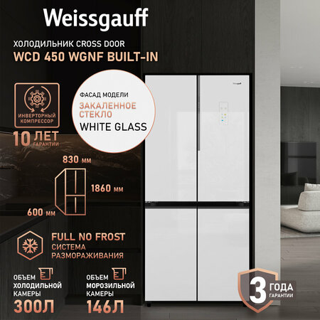 Отдельностоящий холодильник Weissgauff, выполненный в современном европейском дизайне CrossDoor, с технологиями Multi Air Flow, антибактериальным модулем AES Intelligent Stirilization проводящим стерилизацию поверхностей от всех видов микроорганизмов, а также полной системой размораживания Full No Frost с полностью электронным управлением и особенностью конструкции Built-in позволяют установить его в любой кухонный шкаф, воплощает в себе соотношение фантастической вместительности 446 литров- это поистине одна из самых передовых и функциональных моделей холодильников, имеющихся на рынке на сегодняшний день! Воплощая в себе соотношение фантастической вместительности, безупречной эргономики внутреннего пространства, технологического совершенства и великолепного дизайна - он является одним из безусловных флагманов Weissgauff, способным вывести для вас понимание того, на что способен холодильник, на совершенно новый уровень! Серия холодильников BUILT-IN - это идеальное решение для тех, кто ценит стиль и функциональность. Уникальная технология механизма крепления дверей позволяет им открываться, не выходя за габариты холодильника. Это значит, что вы можете легко установить холодильник в любую нишу или декоративный модуль, не оставляя зазоров. Габариты устройства 833 х 600 х 1860 мм - это оптимальные параметры для CrossDoor модели, при выборе которых инженеры Weissgauff руководствовались целью создать для вас максимально вместительный и функциональный холодильник, который при этом окажется удобен в установке и не будет занимать лишнее место на вашей кухне! Объем холодильной камеры 300 литров - дает вам полную уверенность в том, что вы легко сможете разместить в холодильнике сразу все необходимые продукты. А особая эргономика внутренних полок позволит вам оптимизировать внутреннее пространство камеры в случае необходимости! Объем морозильной камеры 146 литров, обеспечит гарантию того, что данная модель предоставит вам достаточно места для заморозки и длительного хранения продуктов! Зона свежести, оснащенная функцией контроля влажности, позволит подобрать оптимальный режим для хранения овощей, фруктов и других продуктов, требовательных к поддержанию особого микроклимата. Инверторный двигатель - это совершенно новая ступень эффективности в сравнении с традиционными линейными моделями! Уменьшенное энергопотребление, минимизация уровня шума, а также увеличение срока службы вашего холодильника - вот лишь некоторые из преимуществ, которые дает инверторная технология в этом замечательном устройстве от Weissgauff! 10 лет гарантии на инверторный двигатель - это живое подтверждение уверенности Weissgauff в качестве выпускаемой нами продукции! Технология Multi Air Flow, перенаправляет потоки холодного воздуха в обеих камерах вашего устройства для обеспечения наилучшего эффекта охлаждения помещенных продуктов! Блокировка от детей защитит ваш холодильник от непреднамеренного изменения настроек вследствие нажатия элементов панели управления! Система размораживания Full No Frost - это наиболее передовая и эффективная система охлаждения обеих камер устройства (и холодильной, и морозильной), обеспечивающая принудительную циркуляцию холодного воздуха и предотвращающая образование наледи на стенках. Фасад модели выполненный в белом станет финальным штрихом в совершенстве великолепного облика 