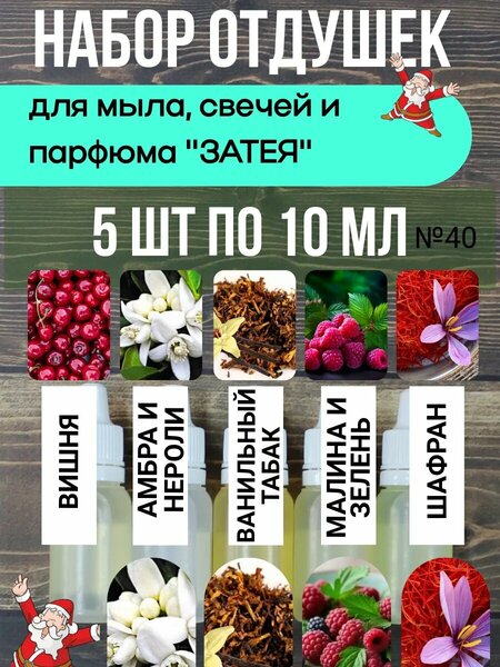 В составе набора отдушки по мотивам ароматов: -Вишня -Амбра и нероли -Ванильный табак -Шафран -Малина и зелень Этот набор парфюмерных отдушек для свечей и мыла станет прекрасным дополнением к вашему парфюмерному арсеналу, предлагая ароматы на любой вкус и для любого случая, будь то романтический вечер или энергичное начало дня. Рекомендуемый процент ввода отдушек в изделие: мыло 1,5-2%, свечи 8-12%, интерьерные диффузоры до 25%, ароматизаторы 20-30%, парфюмерия 20-25%. Не стоит проявлять поспешность и вводить отдушку в горячую смесь, лучше дать ей возможность остыть.