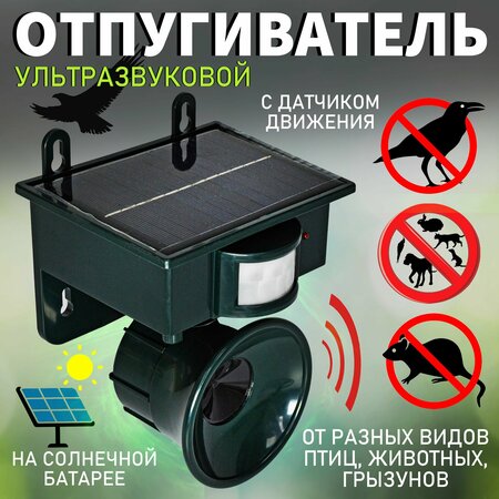 Очень эффективный и мощный ультразвуковой отпугиватель. Оснащен датчиком движения - при обнаружении какого-либо движения активирует систему излучения ультразвуковых частот, которые в зависимости от уровня настройки способны отталкивать птиц, кошек, собак, крыс, лис и т. д. Возможность регулировки частоты позволяет выбирать животных, которых вы хотите отпугнуть. Отпугиватель вредителей устойчив к погодным условиям, предназначен для использования на открытом воздухе. Может работать как от солнечной батареи, так и от встроенного аккумулятора. Инструкция по эксплуатации: Устанавливается с помощью специальных крепежей крепления (входят в комплект). Для лучшей производительности рекомендуется разместить устройство на высоте не менее 1 метра над землей для обеспечения оптимального диапазона работы устройства. Убедитесь, что датчик обращен к той области, на которую вы хотите воздействовать. Разные частоты отталкивают разных животных. Некоторые частоты могут отталкивать одновременно нескольких животных. Уровень регулируется с помощью вращения кнопки. Чтобы активировать устройство нажмите один раз на кнопку ВКЛ/ выкл. После нажатия светодиод загорится красным и активирует систему, а через 9-11 секунд автоматически перестанет излучать ультразвуковую частоту. Устройство будет снова активировано, если обнаружит дальнейшее движение животного. Характеристики: Размеры: ~ 13 x 16 x 9 см; Солнечная панель: 6 В; Диапазон работы: 450 квадратных метров; Рабочий ток: менее 180 мА; Ток в режиме ожидания: менее 2 мА; Ультразвуковая частота: 12 кГц-30 кГц (регулируемая).