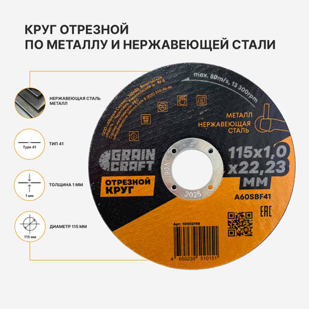 Круг отрезной предназначен для работы по металлам и нержавеющим сталям. Идеально подходит для профессионального использования: там, где обычный круг в два счета выходит из строя, этого хватит надолго. Все дело в используемых при производстве материалах – качественном зерне из оксида алюминия и надежном полимерном связующем. Преимущества: долгий срок службы; быстрые и чистые резы без образования заусенцев и изменения цвета заготовки; отсутствие дефектов реза. Отрезной круг по металлу и нержавеющей стали 115х1х22,23 мм тип 41 GRAINCRAFT - это профессиональный инструмент для работы с металлами и металлическим профилем. Долговечность и надежность: круг изготовлен из качественного зерна оксида алюминия и надежного полимерного связующего, что обеспечивает долгий срок службы и устойчивость к износу. Быстрый и чистый рез: благодаря качественным материалам, круг обеспечивает быстрые и чистые резы без образования заусенцев и изменения цвета заготовки. Отсутствие дефектов реза: благодаря использованию качественных материалов и технологии производства, круг обеспечивает отсутствие дефектов реза, что гарантирует высокое качество обработки металла. Рекомендуемая максимальная скорость работы составляет 80 м/с, а максимальное количество оборотов - 13 300 оборотов в минуту. В упаковке поставляется один отрезной круг диаметром 115 мм, толщиной 1 мм и посадочным диаметром 22,23 мм. Выбирая отрезной круг по металлу и нержавеющей стали 115х1х22,23 мм тип 41 GRAINCRAFT, вы получаете надежный и качественный инструмент для профессионального использования.