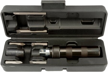 Отвертка ударная применяется при монтаже резьбовых соединений для создания больших крутящих моментов которые не могут быть созданы вручную. Также отвертка может использоваться с торцовыми головками 1/2. Ударно-поворотный механизм отвертки позволяет преобразовать энергию удара молотком по ее затыльнику в поворотное усилие для заворачивания или отворачивания крепежа. Механизм поворота и насадки изготовлены из хромованадиевой инструментальной стали. Имеет стандартный присоединительный квадрат 1/2 (12,5 мм). Укомплектована переходной головкой с квадрата 1/2 на шестигранник 8 мм для присоединения вставок. Поставляется с шестью насадками: Насадки шлицевые – SL6x35, SL8x35, SL8x70 мм, Насадки крестовые Phillips – PH2x35, PH3x35, PH3x70. Защищена от коррозии оксидированием. Индивидуальная упаковка – пластиковый футляр