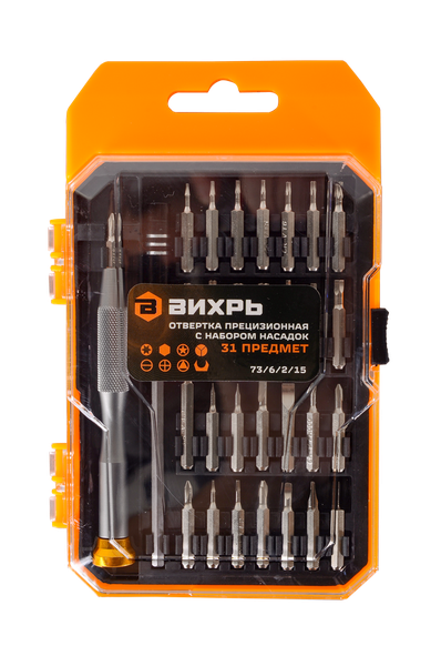 Отвертка Вихрь прецизионная с набором насадок, 31 предмет в кейсе Отвертка Вихрь прецизионная с набором насадок, 31 предмет в кейсе, подходит для домашнего и профессионального использования. Она предназначена для ремонта телефонов, компьютеров, приемников и многих популярных приборов, которые используются в быту. Набор инструментов и оснастки В комплекте 31 предмет, включая 28 сменных бит и прочный кейс для удобного и рационального хранения и транспортировки. Инструменты из набора выполнены из качественной хромванадиевой стали, что обеспечивает высокую прочность и долговечность. Удлинитель 60 мм позволяет работать в труднодоступных местах, а металлическая прочная рукоятка обеспечивает надежный хват и комфорт во время работы. Выбирая отвертку Вихрь прецизионную с набором насадок, вы получаете надежный и качественный инструмент для выполнения широкого спектра работ.