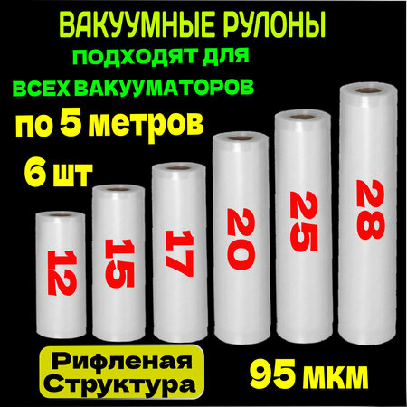 Пакеты для вакууматора рифленые Набор рифленых вакуумных рулонов 12,15,17,20,25,280см * 5 метров Рифленый вакуумный рулон/ Вакуумная пленка / пленка для вакууматора / пакеты для сувид- помогут продлить сроки хранения продуктов и готовых блюд. Изделие изготовлены из пищевого полиэтилена-полиамида PA/PE, не выделяющего токсинов и запахов при высоких температурах и длительном нахождении рядом с едой. Универсальный пакет подходит для вакуумных упаковщиков Redmond, Bork, Zepter vacsy, Caso, Profi Cook, Gochu и любых других. В вакуумных пакетах можно варить, разогревать в микроволновой печи. Подходит для приготовления блюд по технологии Су вид (Sous Vide) Толщина: 95 микрон первая сторона, 95 микрон вторая рифлёная сторона. Температурный режим: от -40С до 100С. Длина: 5 метров