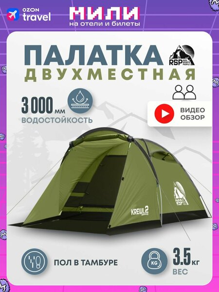Палатка треккинговая двухместная RSP Krewl 2 идеально подойдет как для туристических походов, так и отдыха с семьей на природе. За счет маленького веса и небольших габаритов в сложенном виде пользуется большой популярностью для пеших походов, а также вело и мото путешествий. Тент палатки изготовлен из прочного и в то же время легкого материала Polyester 190T 63D с показателем водонепроницаемости 3000 мм. водного столба, что является очень высоким показателем и способен выдержать любой дождь. Тент палатки имеет пропитку задерживающую распространение огня. Дно палатки изготовлено из армированного полиэтилена – терпаулинга, который является очень крепким материалом показателем водонепроницаемости 10 000 мм. водного столба. Каркас палатки изготовлен из высококачественных фиберглассовых сборных дуг с металлическими наконечниками, они обладают хорошей гибкостью и большим запасом прочности. В комплекте палатки поставляются штормовые оттяжки и колышки с помощью которых можно надежно закрепить палатку на случай непогоды и сильного ветра. На входе в палатку имеется просторный тамбур, в котором вы сможете расположить свои вещи и обувь. Тамбур снабжен дополнительной дугой, которая поддерживает крышу тем самым увеличивает его объем и делает эксплуатацию более комфортной. Так же в тамбуре предусмотрен съемный пол, который идет в комплекте с палаткой. Отличительной особенностью данной модели являются большие вентиляционные окна с двух сторон, которые снабжены специальными опорами с помощью которых можно осуществлять регулировку потока воздуха. Благодаря профессиональной мелкой москитной сетке, которой продублированы двери в спальню и вентиляционные окна, удалось добиться отличной вентиляции и при этом защитить палатку от всех видов насекомых в том числе от мелкой мошки. В спальне палатки предусмотрены карманы для хранения вещей, а также крючок для подвешивания фонаря. Молнии и бегунки в палатке очень высокого качества, на бегунках установлены тканевые пуллеры салатового цвета, благодаря им открывать и закрывать дверь на много удобнее, а в темное время суток проще найти бегунок. Чехол палатки изготовлен из прочного материала Oxford 300D, снабжен фастексами и утягивающей стропой для удобства упаковки палатки, а также ручками для переноски. Внутри чехла находится инструкция, которая напечатана на ткани и пришита к чехлу, теперь можно не бояться, что она потеряется или намокнет.