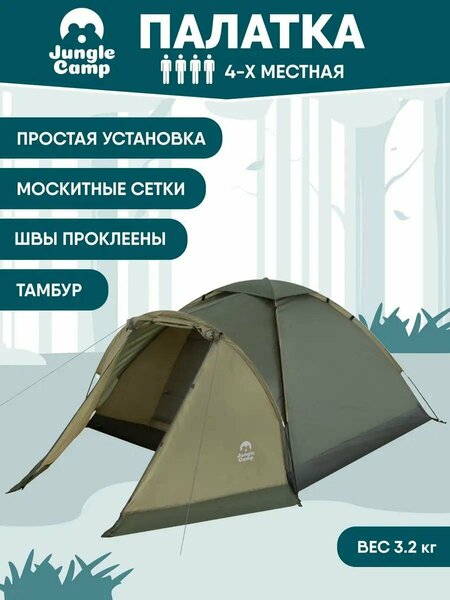 Однослойная четырехместная палатка с тамбуром JUNGLE CAMP Toronto 4, самая легкая и быстрая в установке палатка. особенности модели: - Палатка легко и быстро устанавливается, - Палатка оснащена вместительным и защищенным от непогоды тамбуром, - Тент палатки из полиэстера, с пропиткой PU водостойкостью 1000 мм, надежно защитит от дождя и ветра, все швы проклеены, - Каркас выполнен из прочного стекловолокна, - Дно изготовлено из прочного армированного полиэтилена, - Вентиляционное окно сверху палатки не дает скапливаться конденсату на стенках палатки, - Москитная сетка на входе в спальное отделение в полный размер двери, - Удобная D-образная дверь на входе в палатку, - Внутренние карманы для мелочей, - Возможность подвески фонаря в палатке. - Для удобства транспортировки и хранения предусмотрен чехол с двумя ручками, закрывающийся на застежку-молнию. Характеристики: -Количество мест: 4 -Цвет: темно-зеленый, оливковый. -Размер: 240 см х (210+120) см х 130 см. -Размер в сложенном виде: 13 см х 13 см х 65 см. -Материал внешнего тента: 100% полиэстер, пропитка PU. -Водостойкость: 1000 мм. -Материал пола: 100% армированный полиэтилен. -Материл дуги: стекловолокно 8,5 мм. -Вес палатки: 3,2 кг.