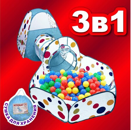 Этот игровой комплекс состоит из 3-х частей: палатки, тоннеля и манежа с кольцом. Залезть в палатку можно через дверцы. Игрушка легко собирается и разбирается, а в сложенном виде очень компактно и не занимает много места. Поставляется в удобной для транспортировки и хранения сумочке на молнии. Размер игрового комплекса в разложенном виде (ДхШхВ) составляет: палатка - 75х75х90см, туннель диаметр - 45 см, длина - 105см, манеж 100х100х37см, высота стенки с кольцом 75см. Внимание, мячики для манежа в комплект не входят!