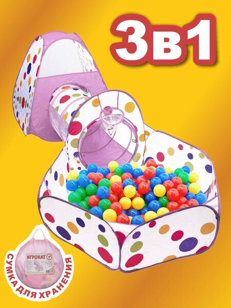 Этот игровой комплекс состоит из 3-х частей: палатки, тоннеля и манежа с кольцом. Залезть в палатку можно через дверцы. Игрушка легко собирается и разбирается, а в сложенном виде очень компактно и не занимает много места. Поставляется в удобной для транспортировки и хранения сумочке на молнии. Размер игрового комплекса в разложенном виде (ДхШхВ) составляет: палатка - 75х75х90см, туннель диаметр - 45 см, длина - 105см, манеж 100х100х37см, высота стенки с кольцом 75см. Внимание, мячики для манежа в комплект не входят!