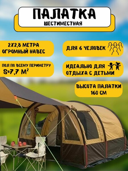 Семейная палатка туннель шестиместная. Для отдыха на природе большой компанией. Общий размер палатки: Размер (внешний) 350*220*160 см Размер (в упаковке) 71*21*21 см Материал внешний 150Д Оксфорд Материал внутренней палатки 190Т 68Д водонепроницаемая дышащая ткань Пол армированный полиэтилен Каркас 9,5 мм фибергласовые Флуорисцентный колышки 25шт Вес 10,35 кг Модель имеет просторный и высокий тамбур с одним входом. В спальном отсеке и в тамбуре есть пол. Пол в тамбуре на липучках. У палатки есть тент-навес он дополнительно дает пространство для отдыха, создает тенек в случае солнечной погоды. Стойки для навеса и растяжки идут в комплекте. В тамбуре есть 4 окна с москитными сетками, которые при необходимости можно закрыть тентом. Сзади палатки также есть окно. Туристическая палатка хорошо проветривается, это особенно важно для жарких летних месяцев. Дверь спального отсека закрывается москитной сеткой. Дверь палатки на входе удобно скручивается и фиксируется сбоку. Спальное отделение двухслойное. В такой палатке сон очень комфортный в любую погоду. Внутри спального отсека имеется одно окно, которое оснащено москитными сетками, а для регулировки освещения могут закрываться плотной шторой.