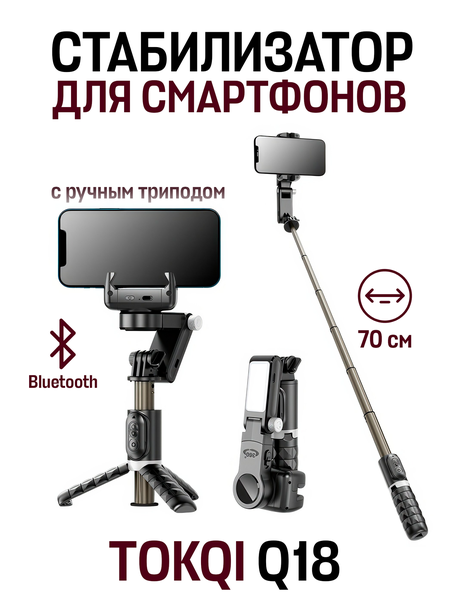 Панорамный стабилизатор для смартфона TOKQI Q18 - это незаменимый аксессуар для любителей качественной съемки. Он обеспечивает стабильное и плавное изображение, позволяя создавать профессиональные фотографии и видео. TOKQI Q18 оснащен ручным триподом и моноподом, что позволяет использовать его как в помещении, так и на улице. Благодаря этому, вы сможете снимать в любых условиях, не беспокоясь о дрожании рук или нестабильности кадра. Стабилизатор совместим с устройствами на базе ОС Android и iOS, что делает его доступным для широкого круга пользователей. TOKQI Q18 имеет несъемный аккумулятор, что обеспечивает его автономность и позволяет использовать стабилизатор без необходимости постоянной зарядки. Особенностью стабилизатора является его способность снимать в вертикальном формате. Это позволяет создавать уникальные вертикальные фотографии и видео, которые будут выглядеть стильно и современно. TOKQI Q18 оснащен Bluetooth и пультом дистанционного управления, что обеспечивает удобство и комфорт в использовании. Вы сможете управлять стабилизатором на расстоянии, не прерывая процесс съемки. Стабилизатор TOKQI Q18 выполнен из высококачественных материалов - ABS-пластика и алюминия. Это обеспечивает его прочность и долговечность. Размеры стабилизатора составляют 155x75x66 мм, а его вес - 260 грамм. Это делает его легким и компактным, что позволяет легко переносить его с собой и использовать в любых условиях. В комплекте с стабилизатором идет подсветка, которая позволяет улучшить качество съемки в условиях недостаточного освещения.
