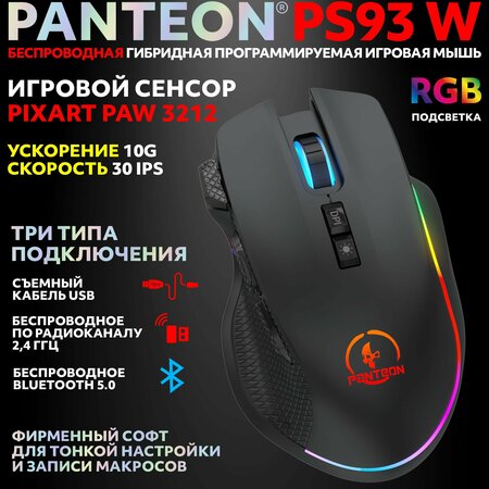 Корпус Модель PANTEON® PS93 W выполнена в эргономичном корпусе длиной чуть более 13 сантиметров с широким левым крылом для поддержки большого пальца и широким правым крылом для безымянного пальца и мизинца. Модель комфортно ложится под среднюю и большую руку, обеспечивая дополнительную поддержку кисти, лучшее скольжение и минимизируя усталость. Матовая поверхность дарит приятные тактильные ощущения, обеспечивает надежный хват, обладает высокой устойчивостью к истиранию и легко поддается чистке. Колесо прокрутки не проскальзывает благодаря рифленой поверхности и четкому шагу прокрутки. Сенсор Надежный сенсор PIXART PAW 3212 обеспечивает точность позиционирования курсора, а также четкую реакцию на движение руки пользователя при скорости и ускорении до 30 IPS/10G. Для достижения максимальной эффективности работы сенсора рекомендуется использовать мышь на специальной игровой поверхности (коврике). Установленные по умолчанию уровни разрешения сенсора - 800/1200/1600/2400/3200/4800 DPI, в любой момент пользователь может выбрать один из предустановленных режимов при помощи кнопки DPI, расположенной рядом с колесом прокрутки. Максимальное разрешение сенсора составляет 7200 DPI и доступно при настройке уровней через ПО. Разработчик сенсора (компания PIXART) не рекомендует использовать максимальное разрешение, чтобы избежать «фризов». Программное обеспечение Фирменный софт позволяет производить персональные настройки мыши - менять функционал кнопок, записывать макросы и настраивать подсветку. ПО доступно для скачивания на сайте panteon в разделе «Скачать ПО».