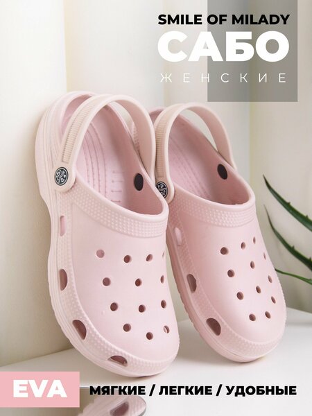Сабо женские летние Smile of Milady изготовлены из очень легкого, удобного и мягкого материала ЭВА (этиленвинилацетат). Пяточный ремешок фиксирует стопу при ходьбе. Внутренняя поверхность подошвы имеет текстуру, создающую массажный эффект. Перфорация в верхней части обуви обеспечивают свободную циркуляцию воздуха. Кроксы отличаются износостойкостью, сохраняют форму при длительной носке и больших нагрузках. Не подвержены воздействию грибка, гипоаллергенны и имеют широкий спектр применения. Сабо для медиков подходят для профессиональных работников индустрии: для врача, для фармацевта, для массажиста, для стоматолога. Тапочки резиновые сабо можно использовать для дома, отдыха, занятий спортом, прогулок, работы в саду и огороде, пригодны для использования работниками в пищевой промышленности. Шлепанцы также могут быть использованы для подростков как сменная обувь в школу.