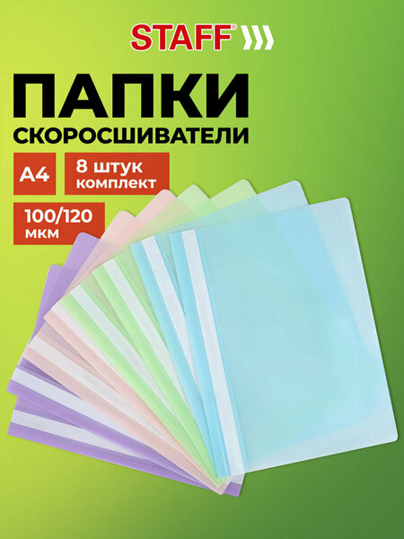 Папка-скоросшиватель STAFF – идеальное решение для систематизации и хранения документов формата А4. Этот набор из 8 шт. включает папки для документов в нежных цветах: аквамарин, мята, лиловый и персиковый. Они не только прекрасно выглядят, но и защищают ваши документы и бумаги от загрязнений, пыли и влаги, благодаря качественному полипропилену. Каждая папка для документов А4 может вмещать до 100 листов, а толщина материала обеспечивает надежную защиту. Простота в использовании: металлические усики и пластиковая планка делают подшивку документов и бумаг легкой и быстрой. Прозрачный верхний лист позволяет видеть содержимое, не открывая папку с файлами А4. Структурируйте информацию с помощью сменного пластикового корешка. Эти канцелярские папки для документов станут незаменимыми в школе и офисе, добавляя яркие акценты на полке. Не упустите возможность организовать свои документы стильно и удобно! • Формат: A4. • Количество в комплекте: 8 шт. • Тип этикетки: сменная. • Верхний лист: прозрачный. • Толщина пластика для верхнего листа: 100 мкм. • Толщина пластика для нижнего листа: 120 мкм. • Серия: Pastel. • Фиксирует до: 100 листов. • Фактура: песок. • Цвет: неоновый ассорти. • Материал: полипропилен. • Высота: 310 мм. • Ширина: 230 мм. • Артикул производителя: 271953.