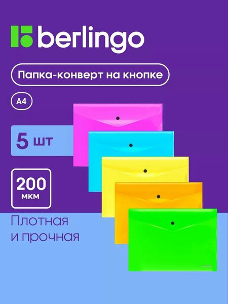 Папка-конверт Berlingo для документов и бумаг А4 на кнопке, 5 штук