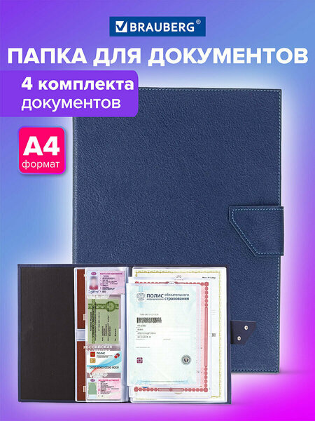 Папка-органайзер семейная BRAUBERG синего цвета — идеальное решение для упорядочивания жизненно важных документов. Разработанная для формата А4, она обеспечивает надежное хранение документов для работы и учебы. Включает в себя 4 файла для документов, 4 для свидетельств о рождении старого образца и 4 для полисов ОМС, что делает её незаменимой в вашей канцелярии. Также папка для документов семейная оснащена 8 карманами для паспортов и 12 карманами для карт ОМС или других карт, обеспечивая полный порядок. Папка выполнена из прочной экокожи с матовыми вкладышами из ПВХ, что гарантирует долговечность и защиту от влаги и пыли. Ее компактный, но вместительный дизайн и надежный хлястик на кнопках позволяют легко организовать все важные бумаги в одном месте. Папка для документов А4 станет вашим надежным помощником и украсит любую рабочую или учебную среду. Выбирайте BRAUBERG и наслаждайтесь порядком и удобством в хранении документов! • Количество комплектов документов: 4. • Тип обложки: твердая. • Материал: экокожа. • Поверхность обложки: фактурная. • Тиснение: -. • Серия: Семейная. • Количество карманов: 36. • Количество кармашков для пластиковых карт: 12. • Отделение для паспорта: да. • Длина: 320 мм. • Ширина: 240 мм. • Толщина: 12.5 мм. • Цвет: синий. • Артикул производителя: 238206.