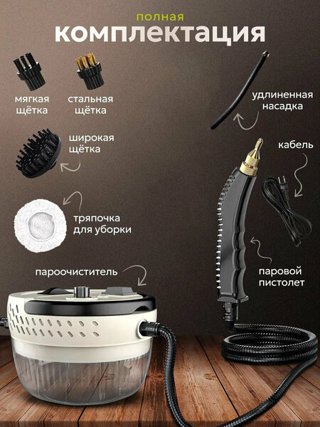 пароочиститель - 1 шт.; насадка для точечной обработки паром - 1 шт.; стальная щетка -1 шт.; мягкая щетка - 1 шт.; широкая щетка - 1 шт..; удлиненная насадка - 1 шт.; кабель -1 шт.; инструкция на русском языке - 1 шт.