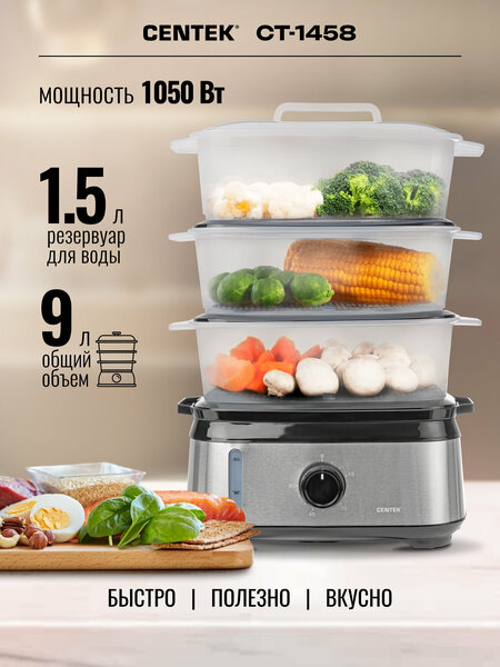 Пароварка CENTEK CT-1458 - это устройство, которое поможет вам приготовить здоровую и вкусную пищу. Корпус пароварки выполнен из нержавеющей стали и пластика, что обеспечивает долговечность и надежность устройства. Серебристый цвет корпуса придает пароварке стильный и современный вид. Пароварка оснащена тремя прозрачными пластиковыми контейнерами, что позволяет наблюдать за процессом приготовления пищи. Общий объем пароварки составляет 9 литров, что позволяет приготовить достаточное количество пищи для всей семьи. Пароварка оснащена механическим типом управления и таймером на 60 минут. Это позволяет вам запрограммировать время приготовления пищи и быть уверенным, что блюдо будет готово к указанному времени. Особенностью конструкции пароварки является наличие чаши для риса, что позволяет готовить рис в соответствии с традиционными рецептами. Пароварка CENTEK CT-1458 оснащена системой защиты от недостатка воды, которая предотвращает возможные опасные ситуации. Пароварка имеет компактные размеры (60х60 см) и потребляет всего 1050 Вт мощности, что делает ее экономичной в использовании. В комплекте с пароваркой идут три контейнера для приготовления пищи, чаша для риса и индикатор уровня воды.