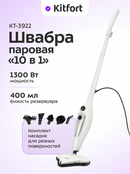 Паровая швабра КТ-3922 — универсальное устройство, которое поможет избавиться от пыли и грязи с помощью мощной струи пара, а также продезинфицирует обрабатываемую поверхность. Уборку паровой шваброй можно проводить без чистящих средств. Конструкция «2 в 1» предусматривает наличие ручного модуля паровой швабры, который удобно использовать с насадками. С помощью насадок можно очистить большинство вещей в доме, а также отпарить одежду. При помощи специальных насадок из комплекта КТ-3922 очистит раковину и плиту на кухне, зеркала, окна и плитку в ванной без каких-либо химических средств, исключительно паром. Плоская нейлоновая щётка удобна для уборки радиаторных батарей и решётчатых поверхностей, а струйная для чистки щелей и углов. Скребок подойдёт для очистки окон, зеркал и кафельной плитки. Насадка с тряпкой для удаления пыли эффективно очищает различные поверхности. Треугольная нейлоновая щётка легко справляется с загрязнениями в углах, а латунная щётка поможет устранить стойкие загрязнения. Регулятор подачи пара позволяет настраивать интенсивность выходящего пара. Это очень удобно при очистке разных типов поверхностей с разным уровнем загрязнения. Чем сильнее загрязнение, тем больше пара потребуется. Устройство оснащено съёмным резервуаром для воды ёмкостью 400 мл, что позволяет производить непрерывную уборку до 15 минут. С помощью мерного стакана из комплекта удобно заполнять резервуар для воды. Напольная щётка по краям оснащена липучками для закрепления тряпки. Рамка для ковра облегчает скольжение щётки для пола по ковру и предотвращает сползание тряпки. Устройство обладает большим углом наклона при уборке, который поможет легко убирать пространство под мебелью. Напольная насадка закреплена на специальном шаровом шарнире с наклоном в двух плоскостях, что делает швабру очень манёвренной и облегчает уборку. Паровая швабра с функцией вертикальной парковки удобно хранится и не занимает много места. У паровой швабры предусмотрены держатели для шнура с обратной стороны прибора. Это способствует комфортному и компактному хранению устройства в домашних условиях. В комплекте предусмотрено множество насадок для различного использования. Спица для чистки предназначена для удаления загрязнений в паровом сопле ручного модуля и насадок.