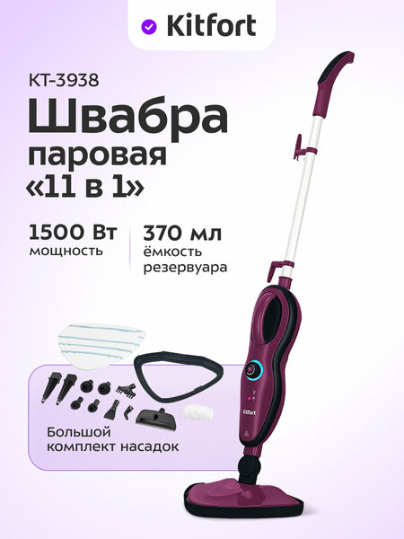 Чистота дома — теперь просто! Паровая швабра КТ-3938 — универсальное устройство, которое поможет избавиться от пыли и грязи с помощью мощной струи пара, а также продезинфицирует обрабатываемую поверхность. Уборку паровой шваброй можно проводить без чистящих средств. Ручной модуль Конструкция «2 в 1» предусматривает наличие ручного модуля паровой швабры, который удобно использовать с насадками. С помощью насадок можно очистить большинство вещей в доме. На все случаи жизни! При помощи специальных насадок из комплекта КТ-3938 очистит напольные покрытия, раковину и плиту на кухне, зеркала, окна и плитку в ванной без каких-либо химических средств, исключительно паром. Поворачивай во все стороны Устройство обладает большим углом наклона при уборке, который поможет легко убирать пространство под мебелью. Напольная насадка закреплена на специальном шаровом шарнире с наклоном в двух плоскостях, что делает швабру очень маневренной и облегчает уборку. Всё необходимое в комплекте! В комплекте предусмотрено множество насадок для различного использования. Также к паровой швабре будут идти мерный стакан, тряпки для пола и рамка для ковра. Удобство хранения При хранении швабра не займёт много места. Шнур длиной 4,9 м не сковывает и не ограничивает ваше перемещение во время уборки. На ручке и корпусе швабры имеются держатели для смотки шнура.