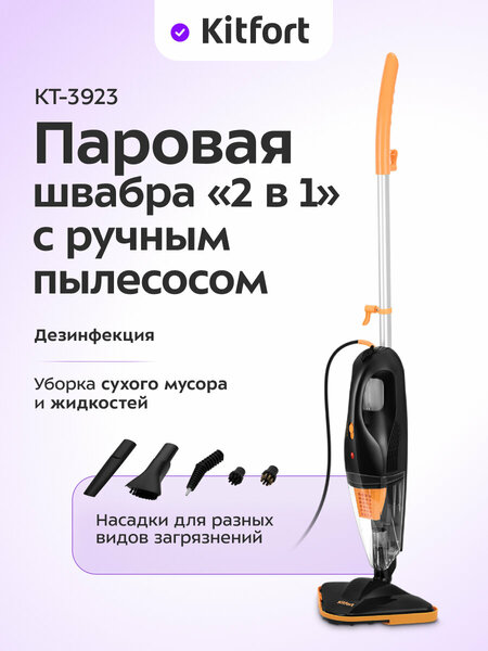 Паровая швабра «2 в 1» с ручным пылесосом КТ-3923 — универсальное устройство, которое совмещает в себе функции паровой швабры и ручного пылесоса. Прибор поможет быстро избавиться от пыли и грязи и продезинфицировать обрабатываемую поверхность. Струйная насадка предназначена для очистки углов, плинтусов, стыков между плитками и других узких мест. Нейлоновая щётка используется для удаления стойких загрязнений (смесители, кафель). Латунная щётка подходит для очистки особо сильных загрязнений. Напольная щётка по краям оснащена липучками для закрепления тряпки для пола. Вы можете использовать тряпку из комплекта или любую другую подходящую ткань, которая сможет зацепиться за липучки. Рамка для ковра облегчает скольжение щётки для пола по ковру. Паровая швабра обладает большим углом наклона, который поможет легко убрать пространство под мебелью. Напольная щётка закреплена на специальном шарнире с наклоном в двух плоскостях, что делает швабру очень манёвренной и облегчает уборку. Устройство оснащено съёмным резервуаром для воды ёмкостью 300 мл, что позволяет производить непрерывную уборку до 15 минут. В комплекте идёт мерный стакан, который предназначен для удобного заполнения резервуара для воды. При подключении устройства к сети загорается световой индикатор. У переключателя 4 положения: высокий уровень подачи пара, низкий уровень подачи пара, выключение, работа в режиме ручного пылесоса. Для использования устройства в качестве ручного пылесоса в комплекте предусмотрены ворсовая и узкая насадки. Ворсовая насадка очистит мягкую мебель, ковры и другие ворсистые материалы. Узкая насадка поможет очистить труднодоступные места и щели. Кроме того, вы можете использовать ручной пылесос без насадок (для уборки гладких поверхностей). Ёмкость пылесборника ручного пылесоса составляет 300 мл при сборе сухого мусора и 50 мл при всасывании жидкостей. Ручной пылесос оборудован двухуровневой системой фильтрации. Фильтр грубой очистки отсеивает наиболее тяжёлые или объёмные загрязнения, попавшие в пылесборник. Фильтр тонкой очистки собирает мельчайшие частички пыли, чтобы они не попали в устройство. У паровой швабры предусмотрены держатели для шнура, что очень удобно при хранении. Зажим для шнура позволяет удобно закрепить шнур питания во время использования и хранения прибора. В комплекте предусмотрено множество насадок для различного использования. При использовании различных насадок можно с лёгкостью убрать любые поверхности в доме. Паровая швабра «2 в 1» с ручным пылесосом КТ-3923 станет вашим главным помощником в уборке, который позволит навести чистоту на всех поверхностях. Для паровой швабры не нужны чистящие средства, поэтому она станет идеальным решением для аллергиков.