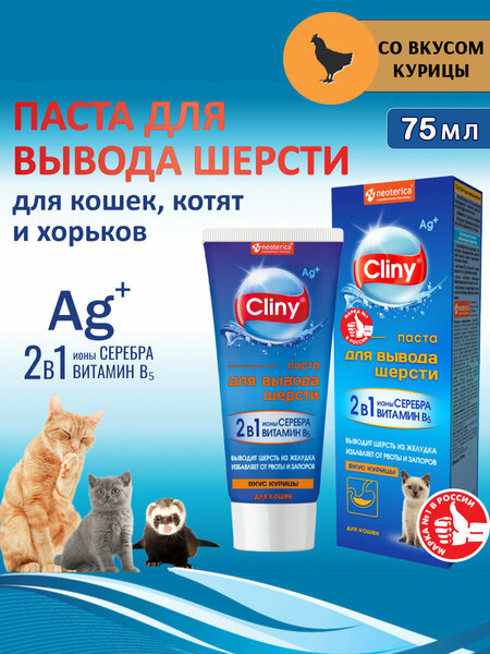 Паста для вывода шерсти для кошек и хорьков Клини 75 мл Домашние кошки, ведущие пассивный образ жизни, вынуждены избавляться от вылизанной шерсти с помощью рвоты. Шерсть может образовывать плотные комки в желудке или кишечнике, мешать пищеварению, провоцировать запоры и даже приводить к непроходимости кишечника. Чтобы кошка не срыгивала шерсть и для отличного пищеварения используйте пасту для вывода шерсти Cliny! Cliny — это первая серия по уходу за животными с ионами серебра. Ионы серебра обладают мощным бактерицидным действием широкого спектра, не вызывают аллергии. Cliny — и гигиена, и профилактика болезней. Паста для вывода шерсти Клини обладает привлекательным для кошек вкусом и ароматом. А для привередливых кошек выпускается в 4 разных вкусах:● Курица● Лосось● Сыр● Классический солодПаста для вывода шерсти Cliny придётся по вкусу самой привередливой кошке. Паста для вывода шерсти Cliny:✔ Выводит шерсть из желудка✔ Избавляет от рвоты✔ Улучшает аппетитИспользуйте пасту для вывода шерсти Cliny:✔ Ежедневно✔ Кошкам и котятам✔ ХорькамАктивные компоненты:● Солодовый экстракт — источник нерастворимой клетчатки. Смягчает волосяные комки и облегчает продвижение через пищеварительный тракт;● Витамин В5 улучшают пищеварение и перистальтику кишечника, необходим для энергетического обмена в организме;● Лактулоза – пребиотик, стимулирует рост полезной микрофлоры кишечника.● Добавки со вкусом и ароматом курицы, сыра или лосося, а так же сухое цельное молоко повышают вкусовую привлекательность пасты. Порядок применения: Давайте пасту в чистом виде непосредственно из тюбика или перемешайте её с кормом. Кошкам и котятам массой до 2 кг — 2 см (1 г), массой более 2 кг — 5 см (2,5 г) пасты ежедневно. Хорькам во время линьки два раза в неделю по 2 см (1 г). Состав разработан компанией Neoterica (Германия).
