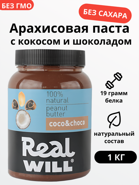 Арахисовая паста Real Will, с кокосом и шоколадом, без сахара, 1кг
