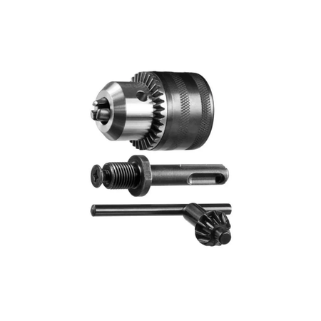 Патрон ключевой 2 - 13 мм 1/2" хвостовик SDS+, ключ Сверлильный патрон используется для крепления сверлильных инструментов, зенкеров и разверток: обеспечивает полный цикл обработки цилиндрических и конических отверстий. с ключом и переходником SDS-plus 1/2 предназначен для крепления на перфоратор оснастки с цилиндрическим хвостовиком диаметром от 1.5 мм до 13 мм. Сверлильный патрон используется для крепления сверлильных инструментов, зенкеров и разверток: обеспечивает полный цикл обработки цилиндрических и конических отверстий. Установка на перфоратор осуществляется благодаря переходнику SDS-PLUS, а зажим самой оснастки в патроне при помощи ключа. Все принадлежности набора выполнены из углеродистой стали.