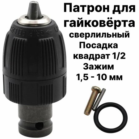 Быстрозажимной сверлильный патрон 1,5 -10 мм с адаптером для гайковёрта. Адаптер переходник насадка подходит для гайковертов с патроном квадрат 1/2 дюйма. Раскрытие губок патрона 1,5 -10 мм. Посадочная резьба патрона 3/8". Сверлильный патрон для гайковерта позволяет использовать гайковерт как шуруповерт и дрель.