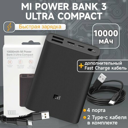 Power bank Xiaomi Mi Power Bank 3 серии Ultra Compact на 10000 mAh с дополнительным кабелем FastCharge в комплекте позволяет действительно быстро заряжать ваши устройства. В данном комплекте два кабеля: один служит для зарядки самого устройства, второй кабель USB-Type-C поддерживает стандарт FastCharge (Quick Charge)и предназначен для ускоренной зарядки устройств поддерживающих стандарт быстрой зарядки Fast Charge. От двух портов USB-A и одного USB-C можно одновременно заряжать три разных устройства. При использовании одного порта максимальная выходная мощность составляет 22,5 Вт что превосходит многие сетевые устройства, обеспечивая быструю зарядку по стандарту FastCharge. Встроенный во внешний аккумулятор для Xiaomi умный чип распознает подключенное устройство и определяет наиболее подходящую мощность для его зарядки, будь то смартфон, планшет, игровая консоль или даже самодельный проект - ни одно устройство не останется без заряда. Дважды нажав на кнопку проверки заряда, можно на 2 часа включить режим зарядки малым током для умных браслетов и гарнитур, не оставляя их без энергии. Корпус внешнего аккумулятора для Xiaomi выполнен из экологичного поликарбоната и АБС-пластика и имеет матовую поверхность с тонким тактильным рисунком, дополняющим общий образ яркой чертой. Кроме того, благодаря такому покрытию аккумулятор прочно лежит в руке или на столе, а также не боится царапин. Power bank - это удобный гаджет, который защитит Ваш смартфон и планшет от разряда. Идеально подходит в ситуации, когда вы не можете воспользоваться традиционным источником питания. Портативный внешний аккумулятор, который позволяет заряжать устройства без подключения зарядного устройства к розетке. Вам не нужно больше уменьшать яркость экрана телефона, отключать WiFi или использовать режим экономии энергии, которая влияет на комфорт использования устройства, особенно на ярком солнце. Интеллектуальная система зарядки, которая распознает тип устройства и выдает необходимое напряжение для более быстрого процесса Powerbank восполнит уровень заряда батареи в вашем смартфоне. Наслаждайтесь работой любимых устройств, независимо от того, где вы находитесь. Модель оптимальна для регулярного использования, так как произведена из прочных износоустойчивых материалов. Небольшой размер и вес аккумулятора способствуют комфортным условиям в процессе эксплуатации, при хранении и транспортировке. Может перевозиться в самолете в ручной клади, отвечает всем вашим потребностям. Портативный и удобный. Это устройство станет вашим верным спутником в поездках и на отдыхе. Благодаря трем разъемам вы можете подключать три девайса одновременно, чтобы с экономить время. Подходит для Android и iOs устройств. Удобно держать в руке и переносить. Можно заряжать смартфоны, планшеты, игровые джойстики и другую портативную электронику. Защита от избыточного заряда, защита от перегрева, защита от короткого замыкания, защита от перенапряжения На корпусе внешнего аккумулятора есть LED индикатор для отслеживания остаточного уровня заряда.