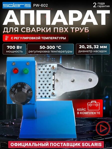 Паяльник для полипропиленовых труб и насадки, Аппарат для сварки пластиковых труб, Solaris PW-602 (600 Вт, 3 насадки: 20, 25, 32 мм) (SOLARIS) (PW-602)