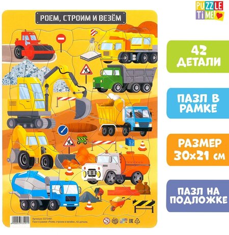 Пазл в рамке "Роем, строим и везём" 42 детали, для малышей, Puzzle Time