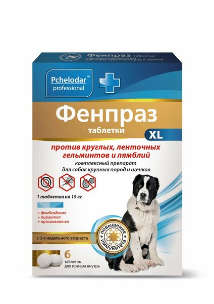 Таблетки для собак крупных пород и щенков PCHELODAR фенпраз xl против круглых, ленточных гельминтов и лямблий (6 таб)