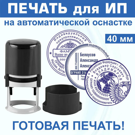 Печать индивидуального предпринимателя на автоматической оснастке. Печать индивидуального предпринимателя оснащена автоматической оснасткой, что обеспечивает удобство и надежность использования. Вам не придется тратить время на установку и настройку печати, а также беспокоиться о том, что она может сломаться. Печать индивидуального предпринимателя по вашим данным имеет стандартный диаметр 39-40 мм. Вы можете выбрать дизайн из нашего каталога, а также указать свои данные огрнип, ИНН, ФИО, город или область. Это позволит вам создать печать, которая будет соответствовать вашим индивидуальным предпочтениям и потребностям. В целом, печать индивидуального предпринимателя с автоматической оснасткой и диаметром 40 мм является отличным выбором для тех, кто ценит удобство, надежность и индивидуальность.