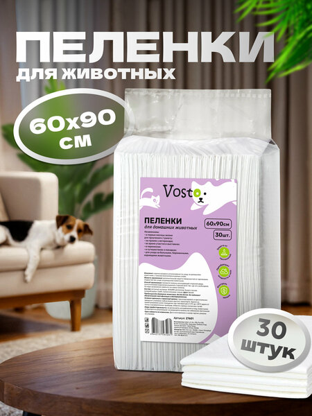 Когда ваш любимец нуждается в уютном и надежном месте для своих дел, гелевые одноразовые пеленки VOSTO с суперабсорбентом SAP будут самым лучшим выбором. Пеленки от бренда VOSTO - это настоящее спасение для заботливых хозяев собак и других домашних животных. Одноразовые пеленки для домашних животных незаменимы в первые месяцы жизни для приучения к туалету, на приеме у ветеринара, во время участия в выставках, в путешествиях и поездках, в переносках, для ухода за больными/беременными/кормящими животными. Их гелевая структура и уникальный суперабсорбент SAP оснащены впитывающими свойствами, что делает пеленки идеальными для обучения маленьких щенков чистоплотности и подходят для использования также у кошек. Одноразовые пеленки имеют размер 60х90 см, что обеспечивает достаточное пространство для комфортного использования как для маленьких щенков, так и для кошек любого возраста. Имеют 5 слоев, что обеспечивает быстрое поглощение влаги и удержание ее в пределах пеленки, а также устранение неприятных запахов. Используя специальные лотки для собак, вы можете легко закрепить подстилку на месте и быть уверены в том, что она не будет скользить или смещаться. Пеленки VOSTO - это не просто туалетные принадлежности, они являются настоящими помощниками в воспитании и обучении животных. С их помощью вы можете создать специальный уголок для щенка или кошки, чтобы они чувствовали себя комфортно и в безопасности. Их использование также позволяет сохранить ваш дом чистым и аккуратным. Гелевые пеленки - прекрасное решение для мобильных хозяев, которые предпочитают брать своих питомцев с собой в поездки или путешествия. За счет своей компактности и удобства использования они станут незаменимыми "туалетами" для ваших любимцев в любое время и в любых условиях. Сделайте выбор в пользу качественных и эффективных гелевых пеленок VOSTO, чтобы ваше животное всегда имело доступ к самому комфортному туалету. Благодаря широкому выбору размеров и количеству пеленок в упаковке, можно без проблем подобрать оптимальный для вас вариант!
