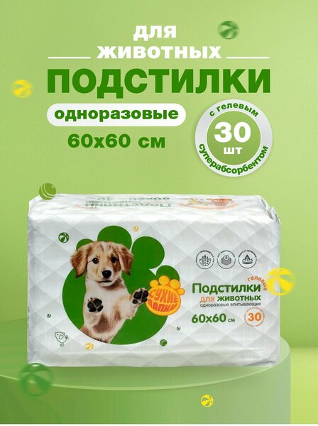 Пеленки одноразовые впитывающие для животных Доброзверики, с суперабсорбентом, 60х60 см. 30 шт.
